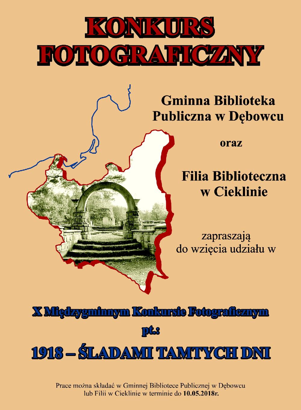 Gminna Biblioteka Publiczna w Dębowcu oraz Filia Biblioteczna w Cieklinie zapraszają do wzięcia udziału w X Międzygminnym Konkursie Fotograficznym pt.: 1918 – ŚLADAMI TAMTYCH DNI.